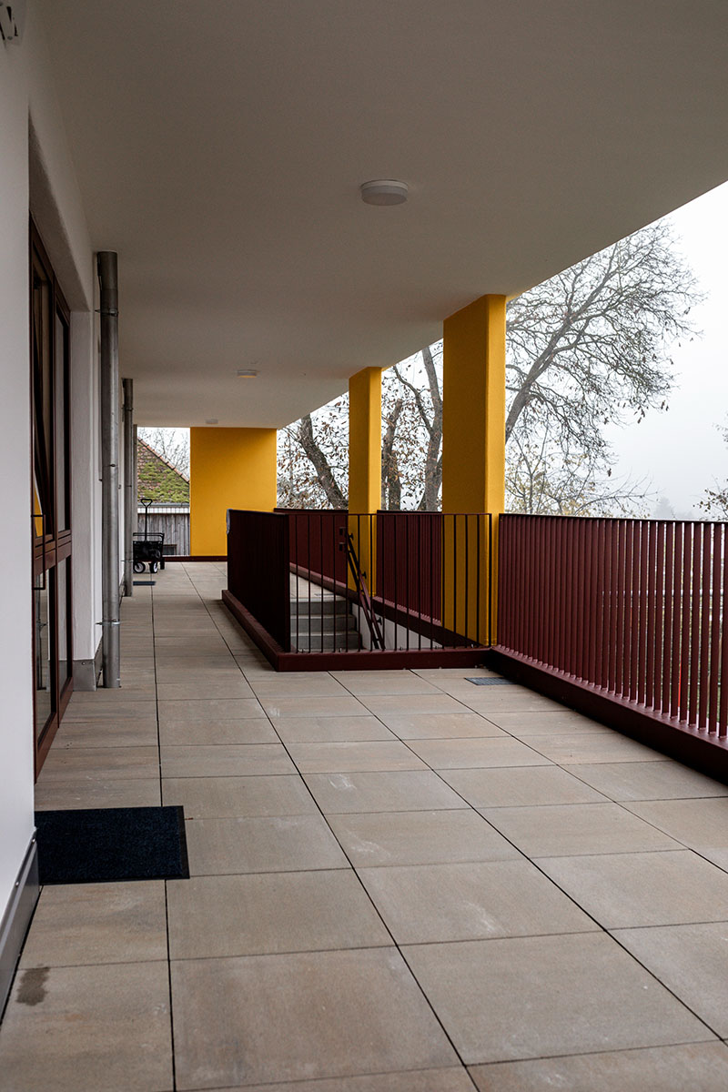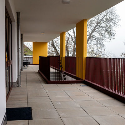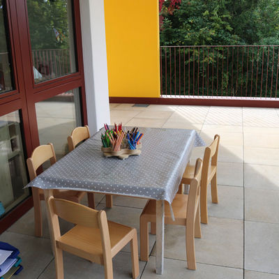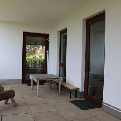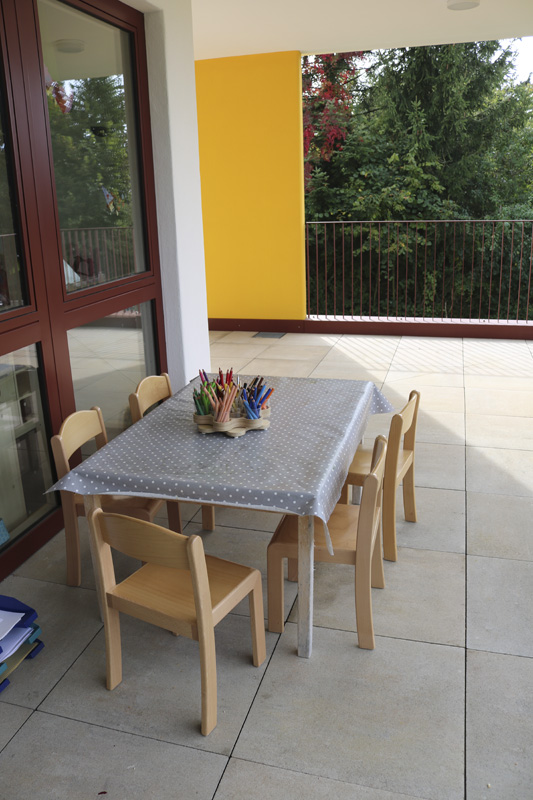 Um die Süd- und Westseite herum befindet sich ein sehr großzügig gestalteter Balkon, der von den Kindern zum Spielen, Malen, Basteln oder Toben genutzt werden kann. Zugleich gelangt man über Treppen nach unten zur Spiel-Terrasse und in den Garten.